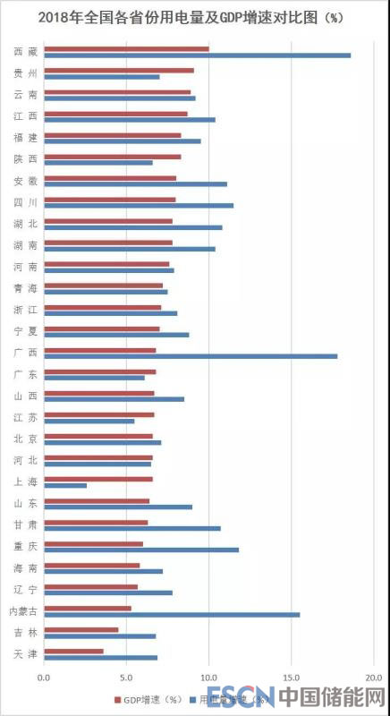 下面將全國(guó)各省用電量與GDP增速做一個(gè)對(duì)比,以用電量增速排序。