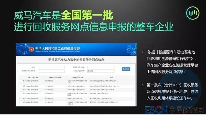另外,依據(jù)《新能源汽車動(dòng)力蓄電池回收利用溯源管理暫行規(guī)定》,汽車生產(chǎn)企業(yè)應(yīng)在溯源管理平臺上傳回收服務(wù)網(wǎng)點(diǎn)信息,威馬汽車第一批次(合計(jì)26個(gè))回收服務(wù)網(wǎng)點(diǎn)信息申報(bào)工作已完成,并納入回收利用體系建設(shè)工作中,成為全國第一批進(jìn)行回收服務(wù)網(wǎng)點(diǎn)信息申報(bào)的整車企業(yè)。