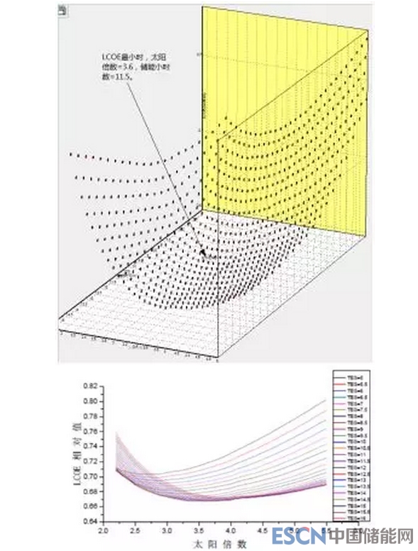 可以從圖紙中找到相應(yīng)的LCOE最低點,此時太陽倍數(shù)為3.6(對應(yīng)集熱場UT槽回路數(shù)為240,反射面積為164.4萬m2),儲能小時數(shù)為11.5h。此時靜態(tài)投資約為38.1(參考數(shù)據(jù))億元。