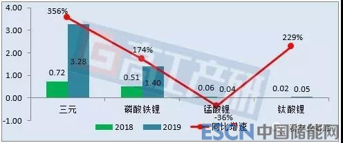 從不同電池類型來看,2019年1月磷酸鐵鋰電池裝機(jī)電量約1.40GWh,同比增長(zhǎng)174%;三元電池裝機(jī)電量約3.28GWh,同比增長(zhǎng)356%;錳酸鋰電池裝機(jī)電量約0.04GWh,同比下降36%;鈦酸鋰電池裝機(jī)電量約0.05GWh,同比增長(zhǎng)229%。