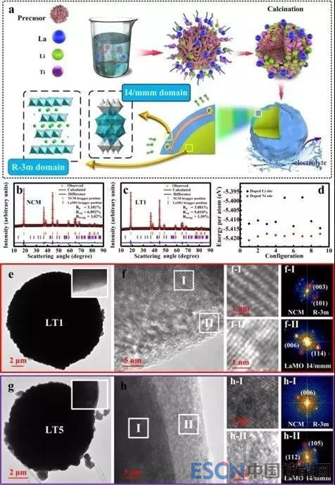 圖2.(a)Ti&LaMO 雙重修飾的合成工藝圖;(b)NCM的結(jié)構(gòu)精修圖;(c)T1的結(jié)構(gòu)精修圖;(d)DFT計算的Ti在不同取代位點的單原子能量。HRTEM及相應(yīng)的FFT圖:(e,f)LT1;(g,h)LT5。