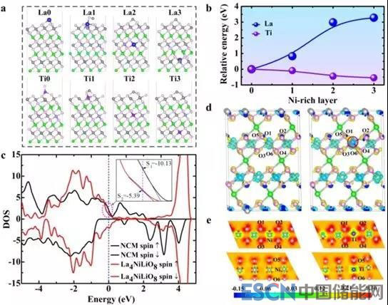 作者們首先采用DFT計算了Ti與La元素分別占到富鎳材料的表面、1st, 2nd, and 3rd相應(yīng)的遷移勢壘,發(fā)現(xiàn)Ti摻入體相而La逃離至表面的狀態(tài)為體系能量最低的狀態(tài)即穩(wěn)定狀態(tài)。通過DOS計算分析可知,La4NiLiO8是電子的良導(dǎo)體。Ti-O鍵比Ni-O鍵鍵能大,有利于抑制相轉(zhuǎn)變。