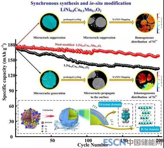 3、TXM和XANES測試表明,LiNi0.8Co0.1Mn0.1O2在循環(huán)過程中存在微裂紋擴(kuò)展,以及二次顆粒結(jié)構(gòu)衰減不一致的現(xiàn)象。雙重修飾成功抑制了LiNi0.8Co0.1Mn0.1O2晶間裂紋的形成和擴(kuò)展,增強了材料結(jié)構(gòu)的穩(wěn)定性和一致性。