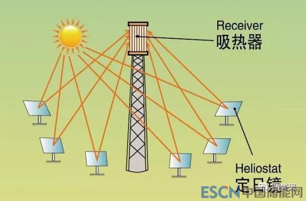 塔式太陽能光熱發(fā)電原理示意圖。太陽光經(jīng)定日鏡反射后聚焦在集熱塔頂端的集熱器,產(chǎn)生大量熱量。這種集熱方式的集熱效率比槽式系統(tǒng)高15%。
