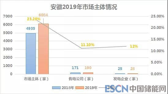 截止2019年2月,安徽電力市場(chǎng)準(zhǔn)入的市場(chǎng)主體已增至6084家電力用戶,其中包括190家售電公司和28家發(fā)電企業(yè)。與2018年的4935家電力用戶、171家售電公司和25家發(fā)電企業(yè)相比,新增了電力用戶1149家、新增售電公司21家、新增發(fā)電企業(yè)3家。市場(chǎng)主體總數(shù)量同比增長(zhǎng)23%,售電公司數(shù)量同比增長(zhǎng)11.1%,發(fā)電企業(yè)同比2017年增長(zhǎng)12%。