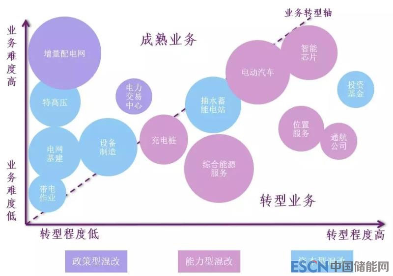 通過對國家電網(wǎng)公司混改的業(yè)務領域和潛在市場規(guī)模進行了研究,梳理了十四個國家電網(wǎng)公司計劃推進及可能推進的混改業(yè)務方向。研究發(fā)現(xiàn)政策型混改主要集中于電網(wǎng)公司的成熟業(yè)務區(qū),能力型混改則更加集中于轉(zhuǎn)型業(yè)務區(qū),資本型混改則在兩個區(qū)域均有分布。這說明了通過混合所有制改革可以確實的助力于國家電網(wǎng)公司達成政策要求和公司戰(zhàn)略目標。