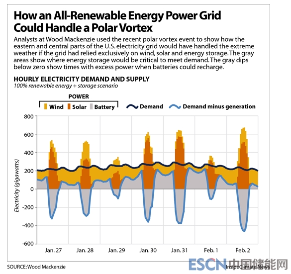 在1月27日-2月2日極度嚴(yán)寒的這一周,分析師測(cè)試了采用50%的風(fēng)力、50%的太陽(yáng)能的電網(wǎng),認(rèn)為將有長(zhǎng)達(dá)18小時(shí)的電力缺口,其中可再生能源沒(méi)有產(chǎn)生足夠的電力來(lái)滿足電力需求,所以需要通過(guò)部署儲(chǔ)能系統(tǒng)進(jìn)行補(bǔ)充。