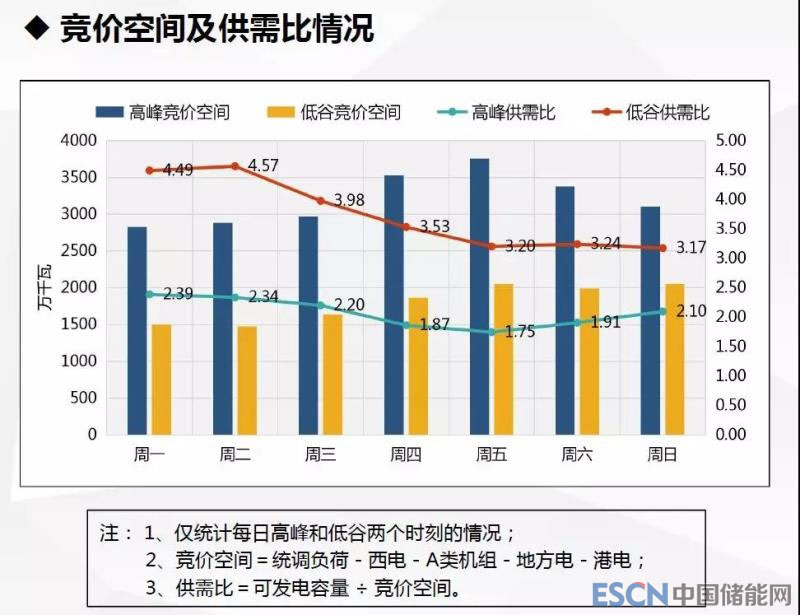 高峰時(shí)刻,競價(jià)空間平均為3205萬千瓦;供需比最高為2.39,最低為1.75。低谷時(shí)刻,競價(jià)空間平均為1796萬千瓦;供需比最高為4.57,最低為3.17。