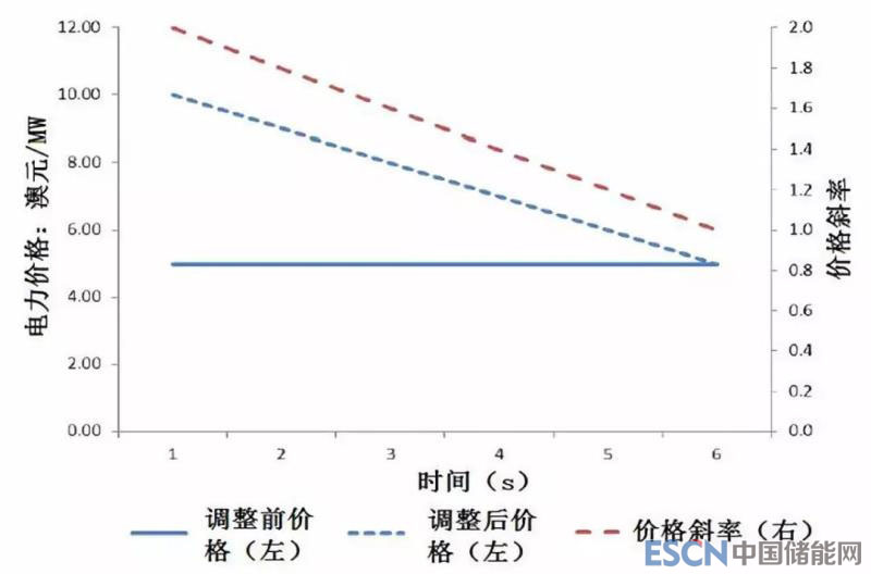 儲(chǔ)能的本質(zhì)是給能量加入時(shí)間變量,這種特質(zhì)決定了儲(chǔ)能在電網(wǎng)中的根本作用是在正確的時(shí)間提供正確的能量。我國可借鑒澳電網(wǎng)目前已經(jīng)開展的考慮時(shí)間權(quán)重的價(jià)格斜率新型調(diào)頻輔助服務(wù)費(fèi)用核算方法,如圖13所示。以6s常規(guī)調(diào)頻輔助服務(wù)為例,圖13中藍(lán)色實(shí)線和虛線為調(diào)整前后的1-6s響應(yīng)時(shí)間對應(yīng)的輔助服務(wù)價(jià)格(對應(yīng)左側(cè)縱軸),紅色虛線為調(diào)整后價(jià)格/調(diào)整前價(jià)格的比率走勢(對應(yīng)右側(cè)縱軸)??梢娙纛l率下跌后1s時(shí)調(diào)頻電源出力,則調(diào)頻電源可得到10澳元/MW獎(jiǎng)勵(lì),是舊規(guī)則5澳元/MW的2倍;若頻率下跌后6s時(shí)調(diào)頻電源出力,則調(diào)頻電源僅得到5澳元/MW獎(jiǎng)勵(lì),與舊規(guī)中效益一樣。