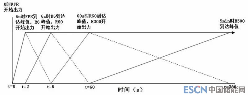 隨著電力系統(tǒng)轉(zhuǎn)動(dòng)慣量逐年減少,系統(tǒng)頻率波動(dòng)幅度愈加增大,傳統(tǒng)調(diào)頻機(jī)組的調(diào)頻響應(yīng)能力仍未提高。因此澳電網(wǎng)引入并開展了新型快速調(diào)頻輔助服務(wù)(Fast frequency regulation 簡稱 FFR)。并將新型 2s FFR 與傳統(tǒng)的 6s、60s、300s常規(guī)調(diào)頻輔助服務(wù)聯(lián)合使用,保持系統(tǒng)頻率下降 300 秒內(nèi)調(diào)頻機(jī)組有功出力總和不變,如圖12所示。未來澳電網(wǎng)將制定 0.5s 甚至 ms 級 FFR 輔助服務(wù)標(biāo)準(zhǔn)。