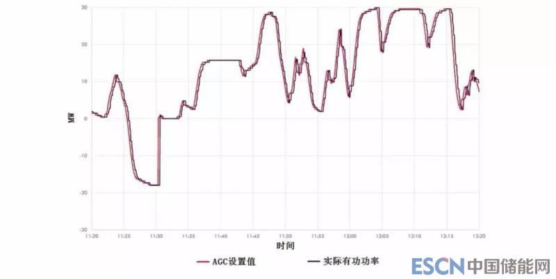我國電網(wǎng)一次調(diào)頻的主力是大型火電機(jī)組,缺乏響應(yīng)速度和調(diào)節(jié)能力俱佳的優(yōu)質(zhì)調(diào)頻電源。而根據(jù)澳大利亞的實(shí)際運(yùn)行經(jīng)驗(yàn),儲(chǔ)能對比傳統(tǒng)火電機(jī)組的AGC跟蹤效果更好。圖7、8分別為2018年1月某日南澳大利亞州傳統(tǒng)大型火電機(jī)組和Tesla儲(chǔ)能的AGC跟蹤能力對比。圖中紅色為電網(wǎng)設(shè)定的AGC曲線,黑色為機(jī)組或儲(chǔ)能實(shí)際有功功率曲線。明顯可見Tesla儲(chǔ)能的響應(yīng)能力對比燃?xì)鈾C(jī)組響應(yīng)能力的擬合度更高,其有功功率輸出更精確且反應(yīng)速度更快。