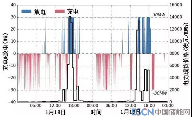 由于2018年1月18日B1機(jī)組跳閘后造成了供小于求的供電緊張。維州和南澳州的電力現(xiàn)貨價(jià)格猛漲至12900澳元/MWh和14200澳元/MWh。Tesla儲(chǔ)能選擇在價(jià)格尖峰時(shí)刻的出力獲得了巨大的經(jīng)濟(jì)收入。圖7為2018 年1月18日-1月19日Tesla出力與現(xiàn)貨市場價(jià)格波動(dòng)對比。其中藍(lán)色放電曲線和紅色充電曲線對應(yīng)左側(cè)充放電功率(MW);黑色價(jià)格曲線對應(yīng)右側(cè)現(xiàn)貨價(jià)格(澳元/MWh)。圖6中Tesla在1月18日17:00-18:00和1月19日14:00-17:00 價(jià)格上升期集中放電,在其余價(jià)格較低時(shí)段充電,在時(shí)間軸上利用自身快速的充放電性能曲線跟隨現(xiàn)貨價(jià)格波動(dòng)曲線,低買高賣盈利。