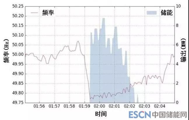2017年12月14日凌晨1:58:59AM,維州電網(wǎng)Loy Yang A3機(jī)組跳閘,直至1:59:19AM 造成560MW功率缺失,同時(shí)維州電網(wǎng)頻率跌至49.8Hz。頻率跌至49.8Hz的140ms后,距離Loy Yang機(jī)組1000公里遠(yuǎn)的南澳Tesla 電 池 儲(chǔ) 能 系 統(tǒng) 快 速反 應(yīng) ,1:59:23AM向電網(wǎng)注入7.3MW有功功率。在 Tesla儲(chǔ)能動(dòng)作4秒后,位于昆士蘭州已簽署調(diào)頻輔助服務(wù)合約的Gladstone 電廠1號機(jī)組才開始向電網(wǎng)注入有功。02:05AM系統(tǒng)頻率恢復(fù)至50Hz。圖4 為12月14日系統(tǒng)頻率和儲(chǔ)能出力情況,可見藍(lán)色曲線的儲(chǔ)能出力(對應(yīng)右側(cè)縱坐標(biāo))在紅色曲線頻率(對應(yīng)左側(cè)縱坐標(biāo))下跌后立即做出反應(yīng)并輸出有功功率持續(xù)至02:03分[12],證明了Tesla優(yōu)秀的快速調(diào)節(jié)能力。
