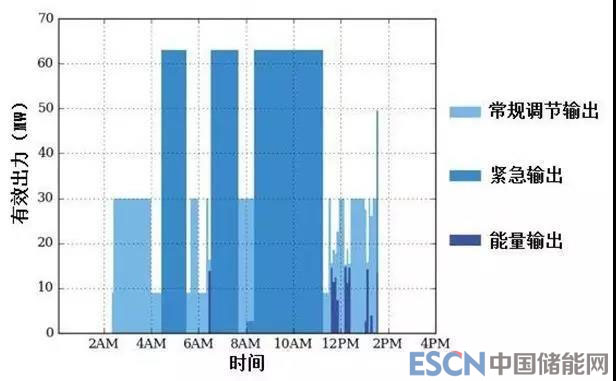 根據(jù)文獻(xiàn)[10][11]的描述,圖3為2017年12月9日Tesla儲(chǔ)能投運(yùn)后的出力情況。由圖3可知,Tesla實(shí)際提供3種有償輔助服務(wù):(1)常規(guī)調(diào)節(jié)輸出、(2)緊急輸出、(3)能量輸出。常規(guī)調(diào)節(jié)最大輸出30MW/90MWh,其余 70MW/39MWh由緊急輸出和能量輸出構(gòu)成[10][11]。在PowerPack儲(chǔ)能單元中常規(guī)調(diào)節(jié)、緊急輸出和能量輸出擁有各自獨(dú)立的控制策略:(1)常規(guī)調(diào)節(jié)輸出以有功和無功功率為控制目標(biāo),通過內(nèi)外雙環(huán)控制調(diào)節(jié)HPR輸出功率。(2)緊急輸出以電壓和頻率為控制目標(biāo),并在內(nèi)環(huán)控制前端設(shè)置了頻率變化感知算法,當(dāng)外環(huán)故障導(dǎo)致系統(tǒng)頻率出現(xiàn)大幅波動(dòng)后自動(dòng)觸發(fā)內(nèi)環(huán),輸出有功功率以維持系統(tǒng)頻率穩(wěn)定。(3)能量輸出控制是基于電力市場價(jià)格信號變化的有功和無功功率雙環(huán)控制,外環(huán)由Tesla對現(xiàn)貨市場的電力價(jià)格進(jìn)行預(yù)判觸發(fā),內(nèi)環(huán)為有功無功功率輸出。