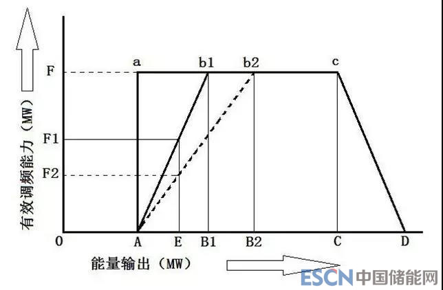以下具體說明:圖1為傳統(tǒng)火電機(jī)組和儲(chǔ)能的調(diào)頻特性對比。橫坐標(biāo)為輸出有功功率,縱坐標(biāo)為對應(yīng)機(jī)組輸出功率的機(jī)組調(diào)頻能力??梢?,傳統(tǒng)火電機(jī)組的調(diào)頻能力在A點(diǎn)開始隨輸出增加而增加,在b1或b2點(diǎn)達(dá)到調(diào)頻能力峰值F,峰值持續(xù)至C點(diǎn)并下落,在D點(diǎn)降至0。不同機(jī)組的調(diào)頻特性不同造成斜率不同(Ab1和Ab2)。而儲(chǔ)能以其放電特性可在輸出初始極短時(shí)間內(nèi)(通常為1s內(nèi))從A點(diǎn)達(dá)到a點(diǎn)獲得調(diào)頻峰值F并持續(xù)。發(fā)電商“延期交易”的做法是在不改變總體輸出有功功率的情況下將A機(jī)組的輸出(Ab1)轉(zhuǎn)移至B機(jī)組(Ab2):即將A機(jī)組出力較少,B機(jī)組出力增加A機(jī)組減少的值,從而在E點(diǎn)處減少多臺機(jī)組的調(diào)頻能力之和(從F1到F2)。發(fā)電商此時(shí)不交易,等待輔助服務(wù)供給短缺造成了輔助服務(wù)價(jià)格上漲之后再“重復(fù)報(bào)價(jià)”,按已上漲的價(jià)格結(jié)算獲取巨額利潤。