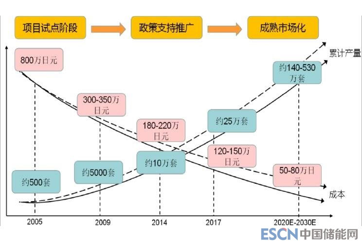 從上圖可知,隨著推廣規(guī)模的擴大,以及幾大廠家的競爭加強,整個系統(tǒng)的成本在快速下降,從最初的800萬日元降至了目前的100萬日元左右,也就是6-7萬元人民幣/套。