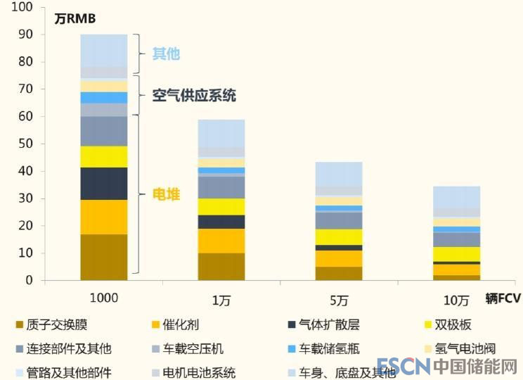 『燃料電池車成本構成及與量產規(guī)模的關系 圖片源自證券研報』
