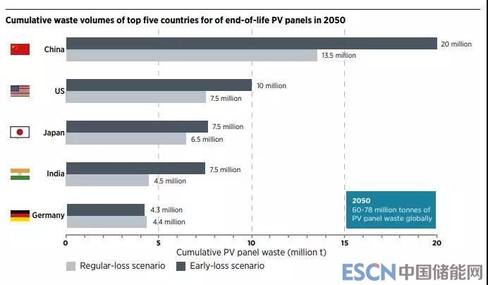 國際可再生能源署(IRENA)的一項研究證實:到2050年,世界范圍內(nèi)報廢的光伏電池板數(shù)量將達(dá)到數(shù)千萬噸(特別是在中國、美國、日本、印度和德國)——回收后價值將超過150億美元。
