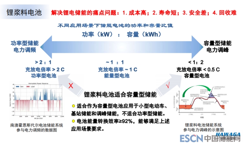 儲(chǔ)能的應(yīng)用場(chǎng)景多元。因此沒(méi)有任何一種技術(shù)能把所有的儲(chǔ)能問(wèn)題解決。鋰漿料電池是典型的容量型電池,不適合在高倍率下運(yùn)用,所以高功率儲(chǔ)能場(chǎng)景需要其他一些新的技術(shù)開發(fā)好應(yīng)用,比如高電壓電池。