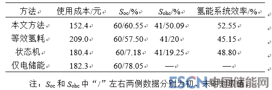 雖然目前尚沒有對微電網(wǎng)能量管理方法進行統(tǒng)一評估及比較的標準,但仍可以引入一些指標來顯示各個控制策略的優(yōu)缺點,幫助對該能量管理方式進行進一步評價?;诿總€運行周期得出結果的對比,可以體現(xiàn)出能量管理系統(tǒng)的性能。本文采用使用成本、Soc、Sohc和氫儲能系統(tǒng)平均效率4個指標,對本文所提出的能量管理方法、等效氫耗方法、狀態(tài)機方法在相同參數(shù)和工況下進行比較;而在僅含有電儲能系統(tǒng)的微電網(wǎng)中,蓄電池的容量調(diào)整為1200 Ah以確保儲能系統(tǒng)的容量滿足系統(tǒng)運行的要求,所得結果如圖9所示。具體指標對比結果如表3所示。