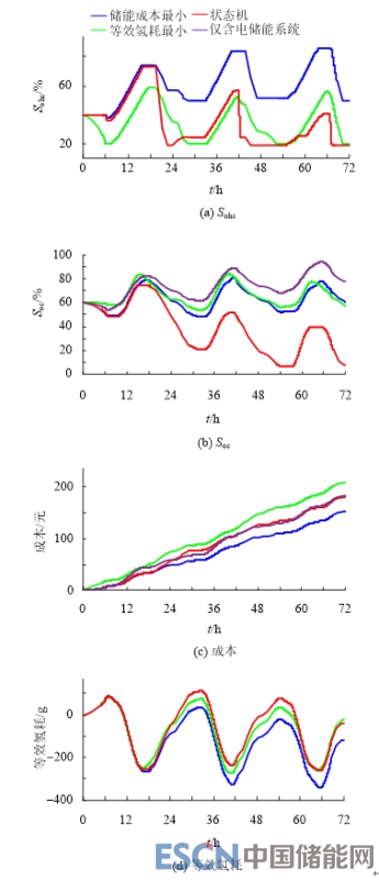 通過實驗結果可知,狀態(tài)機方法無法維持系統(tǒng)的儲能水平,在實驗結束后Soc與Sohc處于極低水平,已無法保證系統(tǒng)的正常運行;而等效氫耗最小方法能夠維持蓄電池荷電狀態(tài)基本穩(wěn)定,其Soc值在24 h、48 h與72 h時均穩(wěn)定在Soc參考值60%附近,但該方法會導致氫儲能系統(tǒng)頻繁地向蓄電池提供能量以維持其荷電狀態(tài),使2種不同類型的儲能系統(tǒng)之間進行了多余的能量交互,從而降低了系統(tǒng)效率,導致系統(tǒng)Sohc一直處于較低水平,同時該種方法的功率分配方式也導致系統(tǒng)使用成本最高;對于僅含有電儲能系統(tǒng)的微電網(wǎng),其使用成本與基于狀態(tài)機的電-氫微電網(wǎng)使用成本相近,但其Soc儲量上升明顯;對于本文所提方法,其成本為優(yōu)先考慮目標,相比較以上3種方法,使用成本分別減少了18.4%、37.1%與19.6.(核實此處是否正確),同時該方法也維持了儲能系統(tǒng)狀態(tài)的穩(wěn)定,Soc終值為60.55%,Sohc終值為50.09%,與系統(tǒng)參考值較為吻合,同時氫儲能系統(tǒng)利用效率最高,為52.55%。