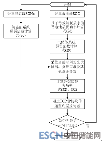 結合式(25)—(29),計算出該時刻下蓄電池、燃料電池及電解槽的功率,將其作為指令傳遞至變流器層進行實際控制。如圖5所示,為頂層能量管理系統(tǒng)工作流程示意圖。