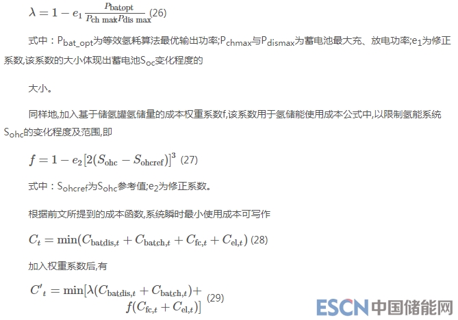 修正系數(shù)e1、e2的大小決定了權重系數(shù)λ與f變化的快慢,即蓄電池Soc及氫儲能系統(tǒng)Sohc回歸參考值速度的快慢,系數(shù)越大,Soc或Sohc回到參考值的速度越快。因此加入權重后,儲能系統(tǒng)使用成本根據(jù)儲能情況存在一定波動,進而對各微源的功率輸出進行一定的修正。
