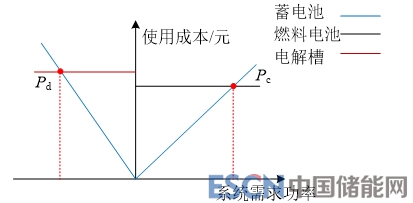 由式(22)可知,蓄電池使用成本與其輸出功率線性相關,而氫儲能系統(tǒng)使用成本在額定功率范圍內(nèi)不變化,則瞬時狀態(tài)下蓄電池與氫能系統(tǒng)使用成本與功率關系可如圖4所示。
