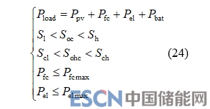 由于系統(tǒng)僅由可再生能源供電,其輸出功率主要受環(huán)境影響。因此,對于給定的負載需求值及光伏輸出功率,能量管理系統(tǒng)的目的是確定存儲設備(電池,電解槽,燃料電池)的最佳運行方式,以便使整個微電網(wǎng)的使用成本最低。與此同時,在孤島系統(tǒng)中,將蓄電池Soc以及儲氫罐Sohc控制在理想范圍內(nèi)也是維持系統(tǒng)穩(wěn)定運行的關鍵,使得儲能系統(tǒng)既能夠在光伏電池輸出盈余功率時提供足夠的儲存容量,同時也能夠有效防止在母線功率缺額時由儲能不足所導致的系統(tǒng)崩潰等嚴重問題。