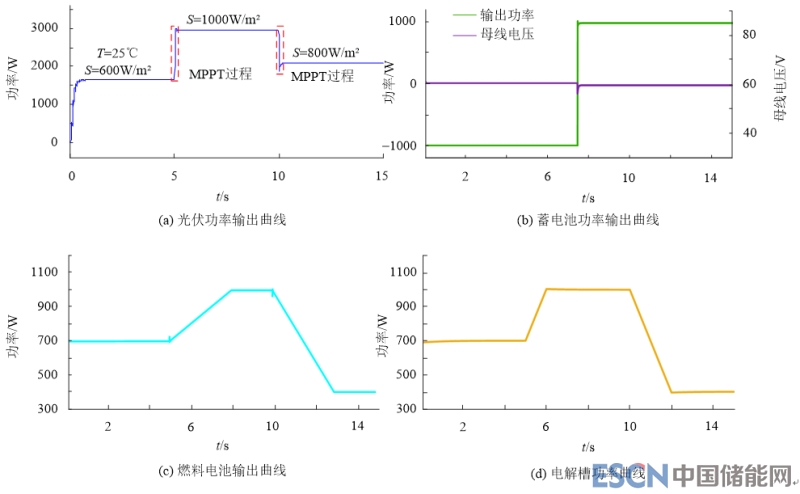 同時,為了防止電解槽及燃料電池功率變化過大從而影響其工作性能,在底層對功率的變化速率進行了限制。如圖3(c)—(d)所示,為燃料電池、電解槽的功率曲線。變流器根據(jù)如圖2所示的電流環(huán)進行控制,使其輸出/輸入功率由700 W增加至1000W再減小至400 W,根據(jù)兩者的功率曲線可知,燃料電池及電解槽能夠根據(jù)給出的參考功率進行工作,且均存在一定的響應時間。