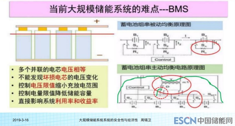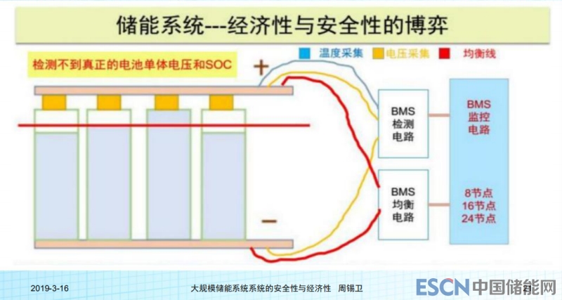 創(chuàng)新技術(shù),這一塊是非常重要的,目前講儲(chǔ)能系統(tǒng)里面實(shí)際上全球都是一樣,在大規(guī)模儲(chǔ)存里面沒有太多的創(chuàng)新技術(shù),都是其他技術(shù)移過來,比如說電動(dòng)汽車的儲(chǔ)能管理技術(shù)。現(xiàn)在國內(nèi)的BMS大部分采用的都是汽車BMS里面的專用芯片,所以成本比較高。在高成本情況下,怎么樣能夠配合在儲(chǔ)能里,把幾顆電芯并起來,并起來成本越低,檢測一個(gè)點(diǎn)芯片的成本固定了,你的電芯多的并在一起就會(huì)減低整體成本,但是帶來一個(gè)致命的危害,幾顆并在一起,這個(gè)電位,大家都學(xué)過電路最基本的原理,并聯(lián)的電路測出來的電位是一樣的,所以并有一顆偏低或者有一顆偏高,你測不到這一顆,也就違反了BMS保護(hù)電芯能測到每一顆最壞的電芯。在這種情況下采取保護(hù)測試,這個(gè)初衷就不對,這個(gè)情況下經(jīng)濟(jì)性嚴(yán)重影響了儲(chǔ)能系統(tǒng)的壽命。