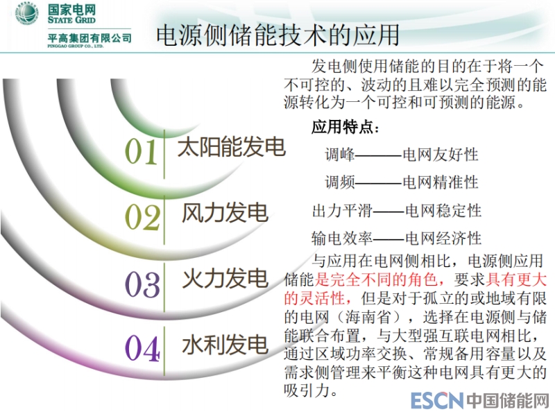 電源側(cè)儲(chǔ)能技術(shù)的應(yīng)用,電源側(cè)從國內(nèi)區(qū)域分西北、東北地區(qū)是太陽能風(fēng)力發(fā)電,華中地區(qū)最多是火力發(fā)電,華東更多是水利發(fā)電。電源側(cè)應(yīng)用儲(chǔ)能的目的,在于不可控的、波動(dòng)的且難以完全預(yù)測的能源轉(zhuǎn)化為一個(gè)可控和可預(yù)測的能源。調(diào)峰-電網(wǎng)友好性,調(diào)頻-電網(wǎng)精準(zhǔn)性,出力平滑-電網(wǎng)穩(wěn)定性,輸電效率-電網(wǎng)經(jīng)濟(jì)性。與應(yīng)用在電網(wǎng)側(cè)相比,電源側(cè)應(yīng)用儲(chǔ)能是完全不同的角色,要求具有更大的靈活性,但是對于孤立的或者區(qū)域有限的電網(wǎng),海南省這些都是獨(dú)立電網(wǎng),選擇在電源側(cè)與儲(chǔ)能聯(lián)合布置,與大型強(qiáng)互聯(lián)電網(wǎng)相比,通過區(qū)域功率交換、常規(guī)備用容量以及需求側(cè)管理來平衡這種電網(wǎng)具有更大的吸引力。