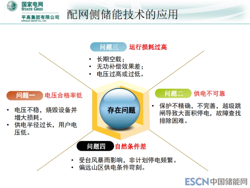 配網(wǎng)側(cè)儲(chǔ)能技術(shù)的應(yīng)用。一是配網(wǎng)末端,從能量守恒來說,發(fā)的電不管是火力、水利,無非就是通過輸電要配出去,現(xiàn)在國內(nèi)每年花大量的資金進(jìn)行配網(wǎng)改造,一是跟經(jīng)濟(jì)有關(guān),二是配網(wǎng)的利用率比較低。一個(gè)就是電網(wǎng)合格率低,第二個(gè)供電不可靠,第三運(yùn)行損耗過高,第四自然條件差。