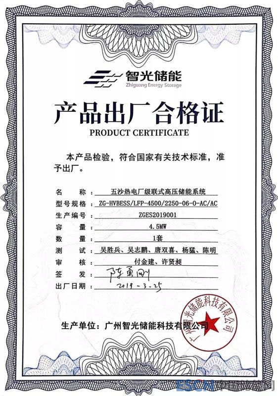 在受邀嘉賓及全場與會人員的共同見證下,智光電氣生產(chǎn)制造總監(jiān)兼首席質(zhì)量官陳勇剛在現(xiàn)場簽發(fā)“五沙熱電廠級聯(lián)式高壓儲能系統(tǒng)”產(chǎn)品出廠合格證,智光儲能公司副總經(jīng)理付金建代表儲能公司接收項目產(chǎn)品出廠合格證。全場響起了熱烈的掌聲,集團副總裁姜新宇隆重宣布,五沙熱電級聯(lián)式高壓儲能設(shè)備成功下線。