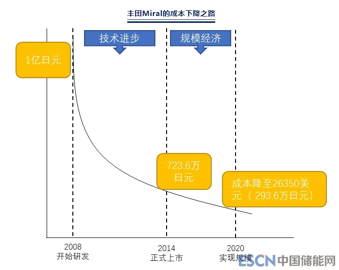 作為世界燃料電池車的領軍者,Miral成本已實現(xiàn)大幅下降。