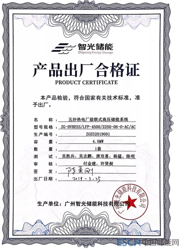 在受邀嘉賓及全場與會(huì)人員的共同見證下,智光電氣生產(chǎn)制造總監(jiān)兼首席質(zhì)量官陳勇剛在現(xiàn)場簽發(fā)“五沙熱電廠級(jí)聯(lián)式高壓儲(chǔ)能系統(tǒng)”產(chǎn)品出廠合格證,智光儲(chǔ)能公司副總經(jīng)理付金建代表儲(chǔ)能公司接收項(xiàng)目產(chǎn)品出廠合格證。全場響起了熱烈的掌聲,集團(tuán)副總裁姜新宇隆重宣布,五沙熱電級(jí)聯(lián)式高壓儲(chǔ)能設(shè)備成功下線。