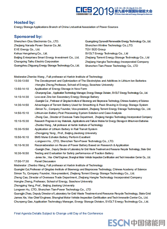 大會(huì)將設(shè)置開(kāi)幕式暨中國(guó)儲(chǔ)能與電力體制改革、國(guó)際儲(chǔ)能與市場(chǎng)、儲(chǔ)能電站與技術(shù)應(yīng)用(四個(gè)專場(chǎng))、儲(chǔ)能成本與投融資、儲(chǔ)能電池與技術(shù)應(yīng)用(兩個(gè)專場(chǎng))、微電網(wǎng)與儲(chǔ)能、氫儲(chǔ)能與燃料電池、能源互聯(lián)網(wǎng)與多能互補(bǔ)、綜合能源服務(wù)、電動(dòng)汽車與電網(wǎng)互聯(lián)、《2019儲(chǔ)能產(chǎn)業(yè)應(yīng)用研究報(bào)告》發(fā)布等15個(gè)專場(chǎng)論壇。