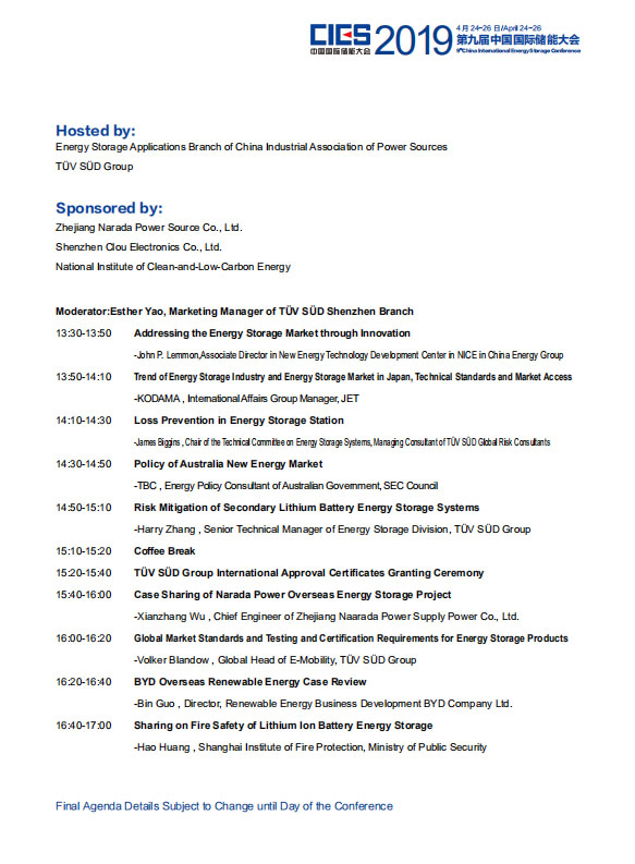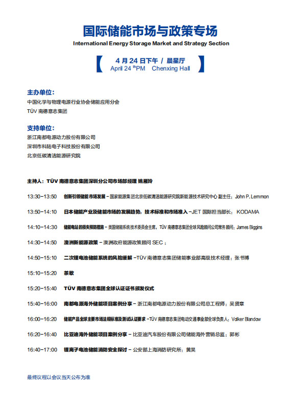 以下是《國(guó)際儲(chǔ)能專場(chǎng)》議程內(nèi)容,其他各專場(chǎng)議程組委會(huì)將相繼發(fā)布,敬請(qǐng)關(guān)注!