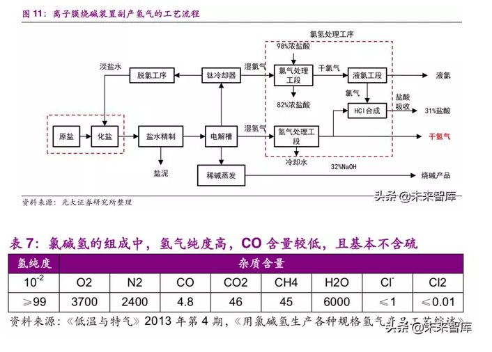 目前包括天然氣重整和煤氣化在內(nèi)的化石燃料制氫盡管適用于大規(guī)模工業(yè) 制氫,但是工藝復(fù)雜、投資較大且能耗較高;焦炭行業(yè)副產(chǎn)的焦?fàn)t氣中雖有大 量氫氣可供提純,但焦?fàn)t氣中氫氣含量(vol)僅有 55%,且伴生大量一氧化碳 和硫化物,因此氫氣提純和精制成本相對較高。而國內(nèi)氯堿行業(yè)目前基本上全 部采用離子膜電解路線,副產(chǎn)氫氣的純度一般在 99%以上,一氧化碳含量較低 且無化石燃料中的有機(jī)硫和無機(jī)硫,因此純化成本相對較低,目前氯堿廠用于 雙氧水生產(chǎn)、制藥、電子和石英加工的回收氫氣成本僅約1.3 元/Nm3。而從規(guī) 模上看,一套 40 萬噸/年的燒堿裝置每年除供下游鹽酸和 PVC 裝置用氫外,仍 可外供 0.3 萬噸氫氣。