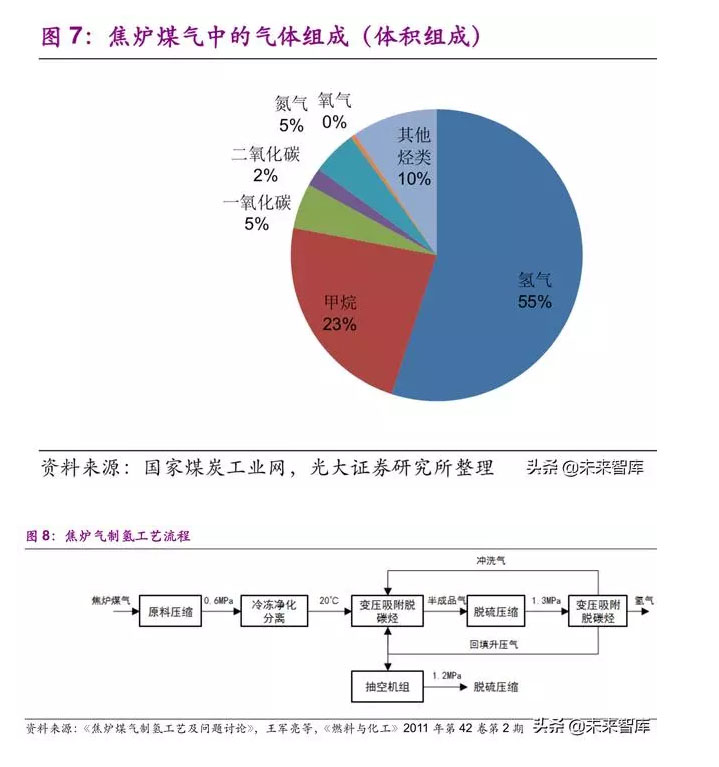 近年來由于環(huán)保要求趨嚴(yán),大部分焦炭裝置副產(chǎn)的焦?fàn)t煤氣下游都配套了 深加工裝置,用來作為合成氨、甲醇、LNG、合成氣制烯烴、合成氣制乙二醇 等裝置的原料。部分鋼廠配套建設(shè)的焦化廠,少數(shù)企業(yè)經(jīng)變壓吸附裝置提純氫 氣,作為冷軋廠等生產(chǎn)過程的保護(hù)氣或作為商品氣出售。除了上述應(yīng)用途徑之 外,仍有 50%左右的焦?fàn)t煤氣作為城市煤氣或企業(yè)自身燃料回爐助燃,因此理 論上全國焦化行業(yè)可以提供 325 萬噸副產(chǎn)氫氣用來滿足燃料電池需求。