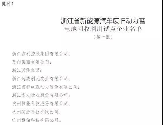 第一批試點企業(yè)包括:吉利集團、萬向集團、華友鈷業(yè)、天能集團、超威創(chuàng)元、南都電源、協(xié)能科技、易源科技、模儲科技等。