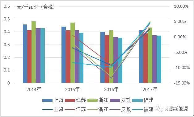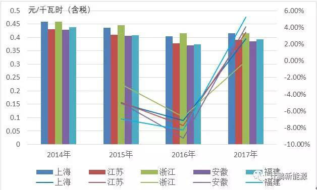 2014~2017年華東電網(wǎng)燃煤平均上網(wǎng)電價(jià)及增長(zhǎng)率