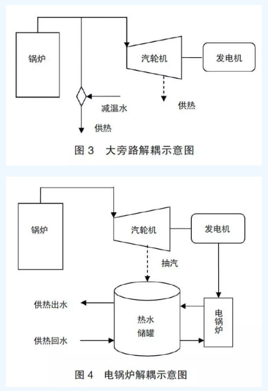 對于熱電聯(lián)產(chǎn)機(jī)組,由于其帶有供熱熱負(fù)荷,所以汽輪機(jī)的最小出力受供熱抽汽量影響很大,因此其改造方式也有不同。為提高其調(diào)峰能力,熱電解耦是目前常用的方式:比如大旁路解耦、電鍋爐解耦、電熱泵解耦技術(shù)等。