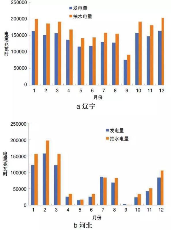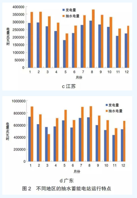 圖2給出了2018年我國幾個典型地區(qū)抽水蓄能電站的運(yùn)行特點(diǎn)。從圖2a中可以看出,遼寧省抽水蓄能電站在每年的10月到次年的4月發(fā)電量及抽水電量較多,而這一時期正是當(dāng)?shù)氐墓┡冢济簷C(jī)組的調(diào)峰能力受到很大的限制;圖2b及圖2c則給出了河北和江蘇兩個省份的抽水蓄能電站的運(yùn)行特點(diǎn),從這兩個省份可以看出,受冬季供暖和夏季空調(diào)的影響,在冬季(12月~次年3月)和夏季(7月份、8月份)蓄能電站的發(fā)電量及抽水電量較多,說明其利用小時或設(shè)備負(fù)荷率較高,其中江蘇省抽水蓄能電站在7月~10月發(fā)電量和抽水電量均較高,是夏季炎熱時間更長的緣故;廣東地區(qū)地處華南,一年中的大部分時間都比較炎熱,所以抽水蓄能電站進(jìn)入5月份以后到10月都基本保持較高的負(fù)荷率,見圖2d。