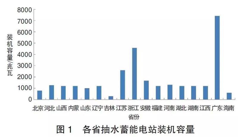 據(jù)中電聯(lián)可靠性管理中心統(tǒng)計(jì),目前在運(yùn)的單機(jī)容量超過4萬千瓦的抽水蓄能電站總?cè)萘考s為3000萬千瓦(各省裝機(jī)容量見圖1)。從圖1中可以看出,廣東、浙江及江蘇抽水蓄能機(jī)組建設(shè)規(guī)模較大,基本與該省的經(jīng)濟(jì)發(fā)展程度相匹配。而西北廣大風(fēng)能太陽能資源豐富地區(qū)的抽水蓄能電站建設(shè)容量較小或沒有,所以,這也是西北地區(qū)的棄風(fēng)及棄光率較高的一個重要原因。