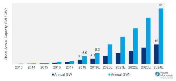 這是調(diào)Wood Mackenzie公司日前發(fā)布的名為“2019年全球儲能展望:2018年回顧和2024年展望”的調(diào)查報告所描繪的發(fā)展前景。該報告預測,未來6年,全球儲能部署將增長13倍,將從2018年的12 GWh增長到2024年的158GWh。