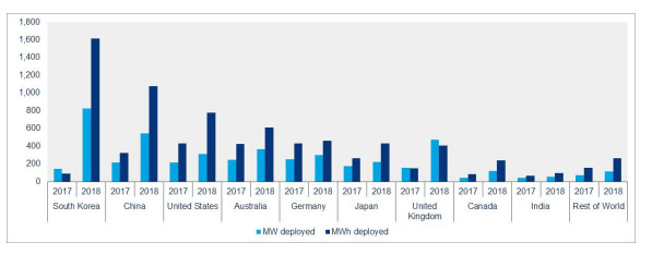 韓國市場也出現(xiàn)了類似的情況,韓國政府規(guī)劃推動大規(guī)模的儲能市場增長,新政策鼓勵以儲能為基礎的風能和太陽能項目的發(fā)展,從而推動2018年的大規(guī)模部署。韓國的電網(wǎng)規(guī)模和商業(yè)和工業(yè)用戶側(cè)儲能部署從2017年的不到10MWh,迅速增長到2018年的1100MWh時,其儲能投資近4億美元,一系列儲能項目已經(jīng)超過了到2020年800MWh的目標。
