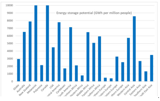 世界各國(guó)和地區(qū)的儲(chǔ)能潛力,單位為千兆瓦時(shí)(GWh)/百萬(wàn)人。為發(fā)達(dá)經(jīng)濟(jì)體提供100%可再生電力所需儲(chǔ)能容量的粗略近似值是20 GWh/百萬(wàn)人