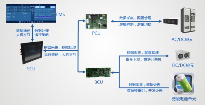 “集”主要指集成化,將PCS系統(tǒng)集成了BCU、PCU、SCU和EMS單元,BCU對電池和DC/DC數(shù)據(jù)采集和和數(shù)據(jù)處理;PCU采集AC/DC單元數(shù)據(jù)進行上傳給SCU,并根據(jù)SCU指令進行邏輯控制。SCU與BCU、PCU、電表等設備進行通訊,實現(xiàn)數(shù)據(jù)處理,進行策略控制及人機交互;同時,內(nèi)部還集成EMS系統(tǒng)。