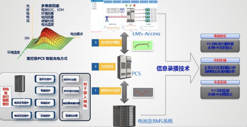 “控”主要指智能管控,在集控鏈PCS內(nèi)部集成的EMS被稱為Access,即設備級EMS,是基于BMS對對電池充放電管控下,增加的智能管控功能,且該功能貫穿于整個充放電過程。當BMS防護失效時,仍能保證充放電的安全可靠,如電池過壓,過充,BMS故障、上傳數(shù)據(jù)不更新或者錯誤時,智能管控檢測電池和BMS狀態(tài)異常,并主動終止充放電。而且具有信息錄播功能,如同儲能系統(tǒng)的黑匣子,能夠主動記錄故障發(fā)生前后的關鍵數(shù)據(jù),用于問題定位、分析和解決。